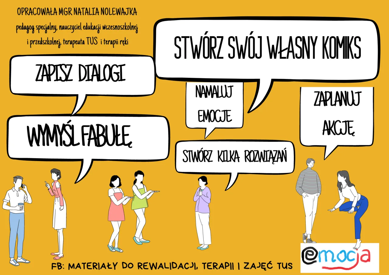 Historyjka obrazkowa społeczna angażuje czytelnika emocjonalnie i intelektualnie. Forma graficzna wspiera proces zapamiętywania i zrozumienia prezentowanych treści.- Łączy elementy wizualne z tekstowymi